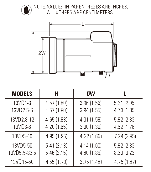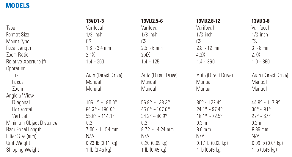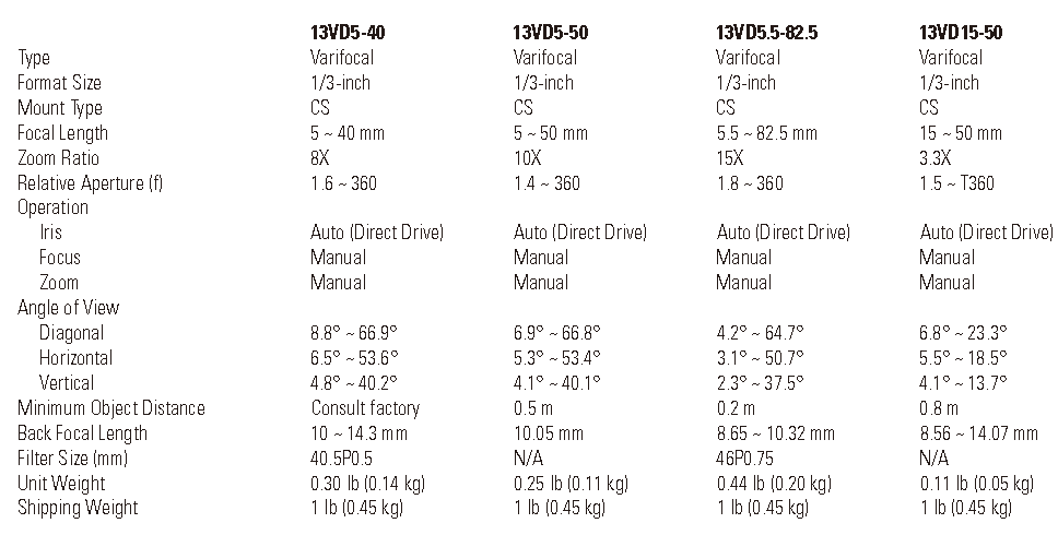 13VD Series lenses will fit all 1/3-inch CS-mount cameras