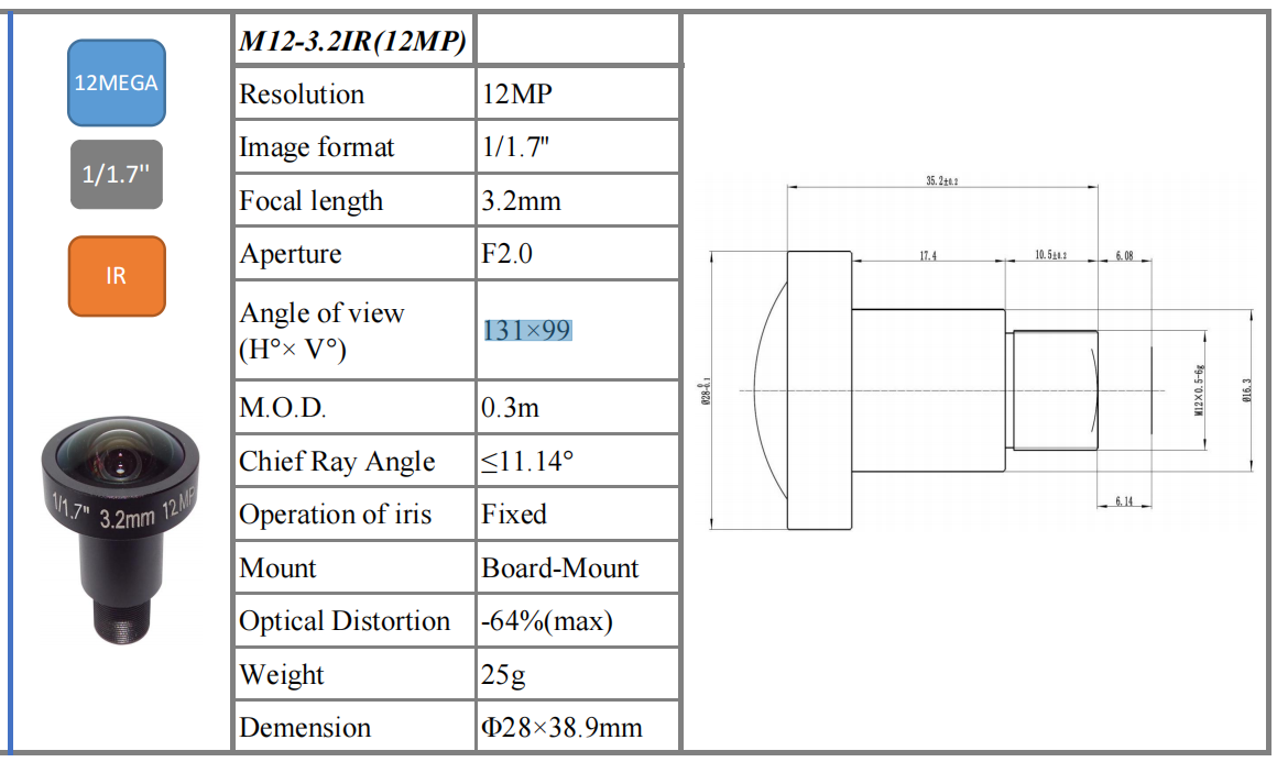 M12-3.2IR(12MP) 1/1.7 format 3.2mm F2.0 12mp M12 4K Board Wide Angle Lens