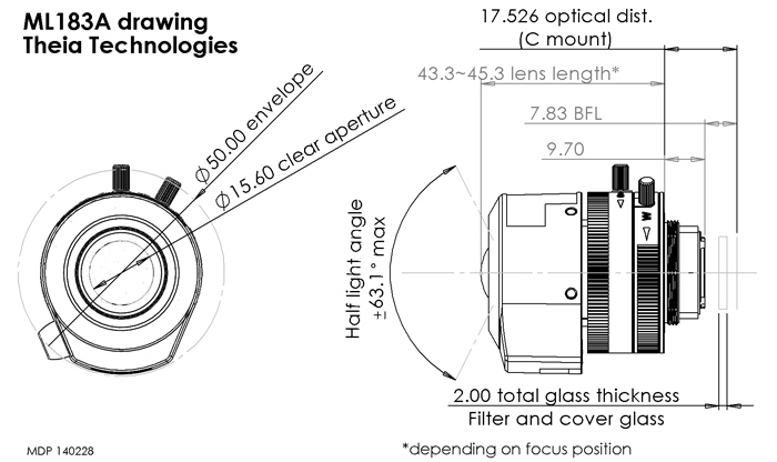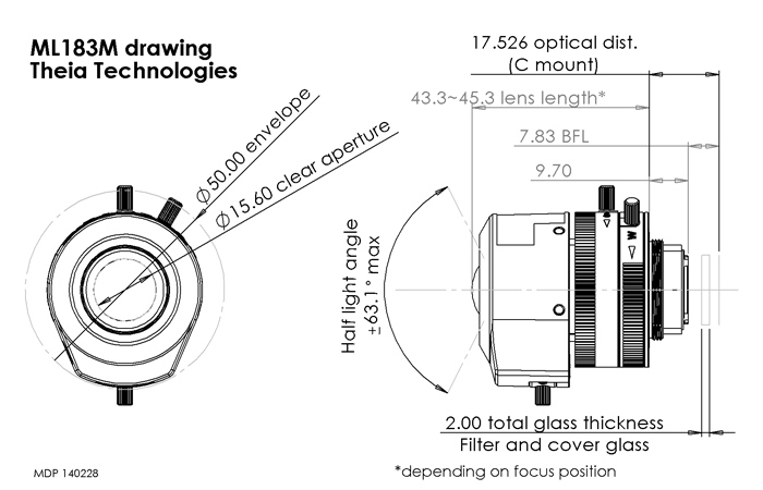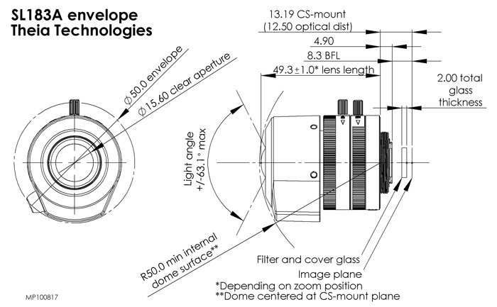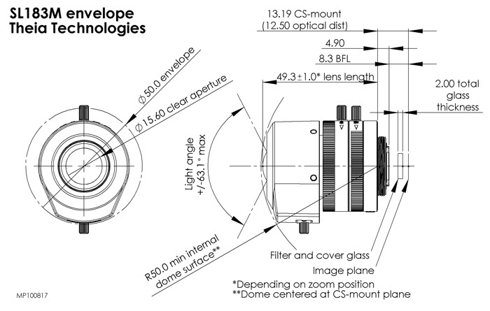 Theia's SL183 (CS mount) and ML183 (C mount) lenses provide ultra wide field of view without distortion. These are varifocal lenses allowing the user to optimize the field of view from wide angle to ultra wide. The lenses incorporate patented Linear Optical Technology® which allows an ultra wide field of view without barrel distortion unlike other wide angle lenses not including Theia's technology. This rectilinear design allows increased resolution at the edges of the image thus increasing the probability of detection.