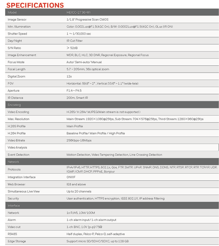 TheHEICC-2736-WIdelivers high definition images of 1080p(1920x1080) resolution at up to 30 frames per second.The True Day/Night function with an IR-cut filter guarantees superior image quality at both bright and dim conditions.Byapplying the H265video compression technologythe HEICC2736-Wistreams high quality images at optimized bandwidth which reduce data volume effectively to save storage space.