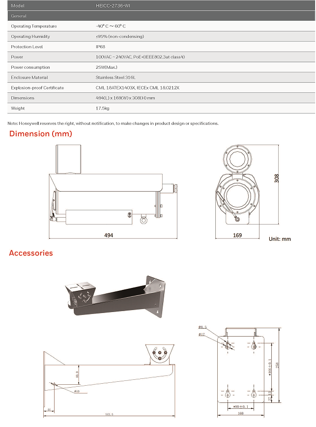 HoneywellHEICC-2736-WIisanIR explosion-proofbulletcamerafeaturing superior1080Phighdefinition image quality and True Day/Nightfunctions.Complied withinternationalexplosionprotectec equipmentstandardsATEXandrated1P68waterproofstandard,thisadvanced Pcamera is designed forinstallation ir potentiallvexplosiveatmospheressuch as petrochemicalfieldsoilrefineries,LNG facilitiesandsoforth