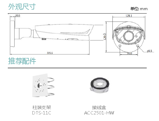 一體化設(shè)計(jì)集成高清自動(dòng)變焦鏡頭、高效紅外燈組與三軸安裝支架