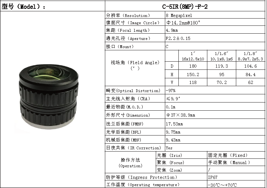C-5IR(8MP)-F-2 Foctek 8百萬魚眼鏡頭焦距4.9MM
